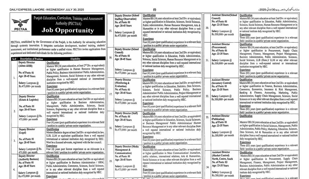 PECTAA is hiring for a wide array of positions across its various directorates. Below is a categorized summary of the roles. For detailed requirements for each specific position, please refer to the official advertisement.