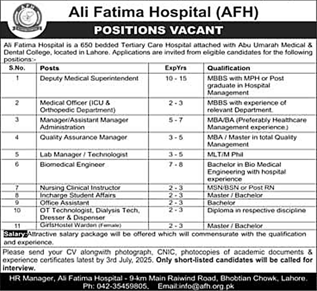 • Address: HR Manager, Ali Fatima Hospital – 9-km Main Raiwind Road, Bhobtian Chowk, Lahore.