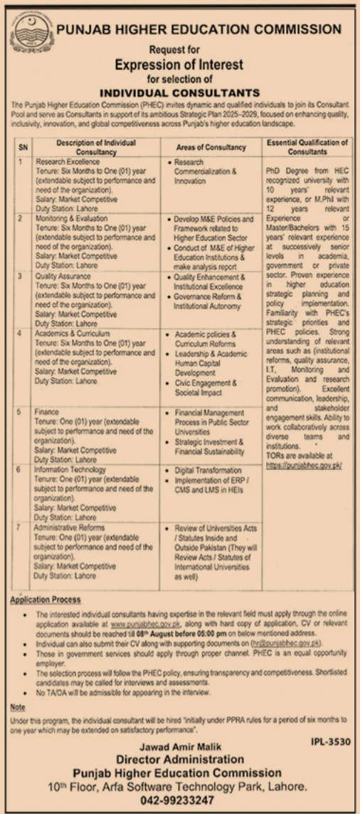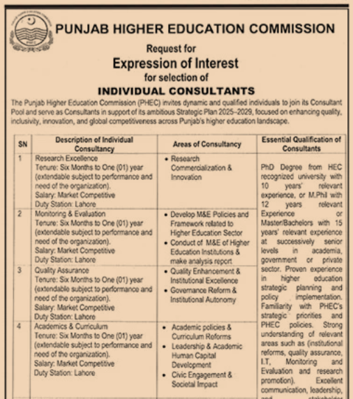 The Punjab Higher Education Commission (PHEC) invites dynamic and qualified individuals to join its Consultant Pool to serve as Individual Consultants. The consultants will be engaged based on enhancing quality, inclusivity, innovation, and global competitiveness across Punjab’s higher education landscape.