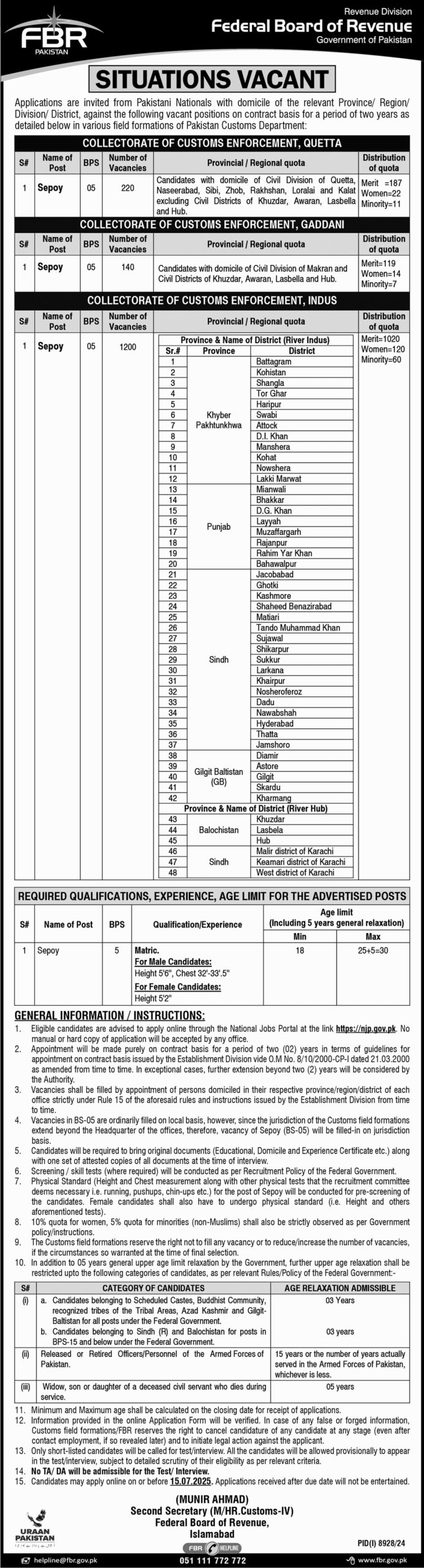 Are you ready to kickstart your career in Pakistan’s most prestigious enforcement agency? The Federal Board of Revenue (FBR) has announced a golden opportunity for Pakistani nationals to join the Pakistan Customs Department as a Sepoy (BPS-05) on a two-year contract basis.