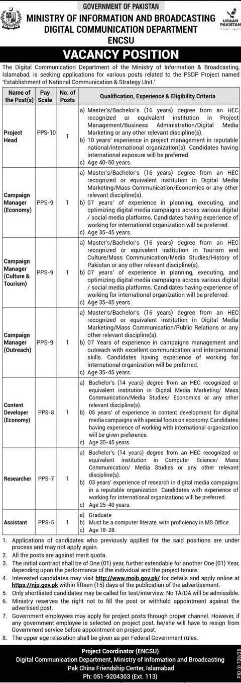 The Digital Communication Department of the Ministry of Information & Broadcasting, Islamabad, is seeking applications for various posts related to the PSDP Project named “Establishment of National Communication & Strategy Unit”.