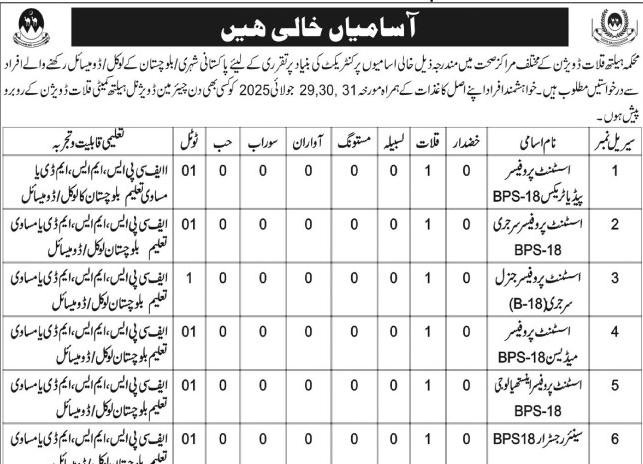 Applications are invited from suitable candidates having local domicile of Balochistan for recruitment against the following vacant posts. Interested candidates should appear for a walk-in interview on the specified dates.