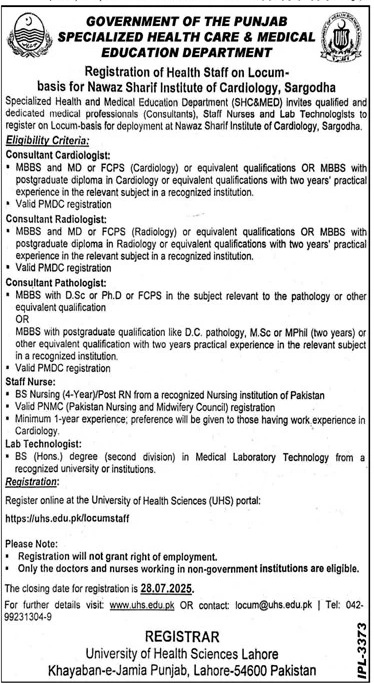 The Specialized Health Care & Medical Education Department (SHC&MED), Government of the Punjab, invites qualified medical professionals to register for deployment on a locum basis at the Nawaz Sharif Institute of Cardiology, Sargodha. Applications are open for Consultants, Staff Nurses, and Lab Technologists.