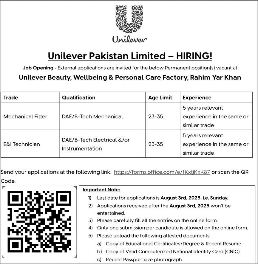 Job Opening – External applications are invited for the below Permanent position(s) vacant at Unilever Beauty, Wellbeing & Personal Care Factory, Rahim Yar Khan.