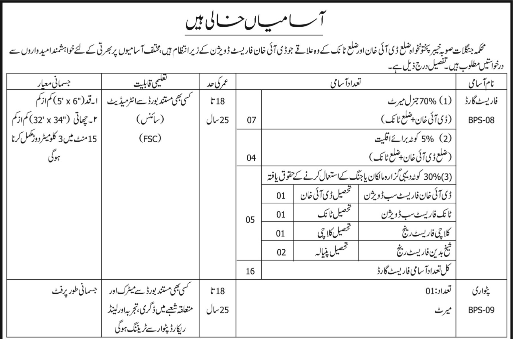 Applications are invited from suitable candidates for recruitment against the following vacant posts in the Forest Department, D.I. Khan, on a permanent basis.