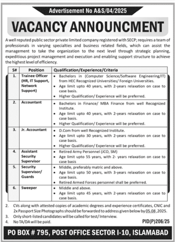 Latest Jobs in A Public Sector Private Limited Company Islamabad