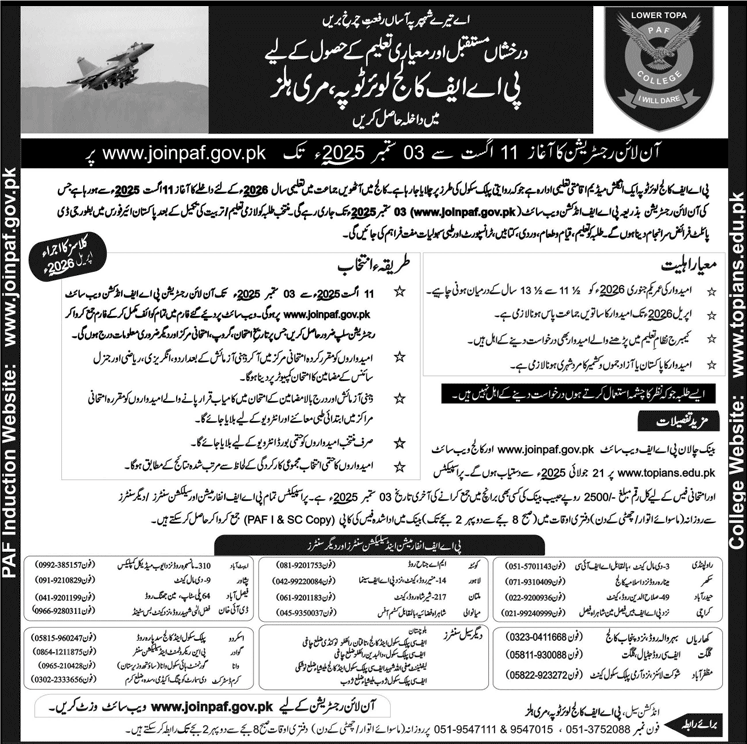 | Online Registration | Official Portal: www.joinpaf.gov.pk Registration Opens: August 11, 2025 Registration Closes: September 03, 2025 |