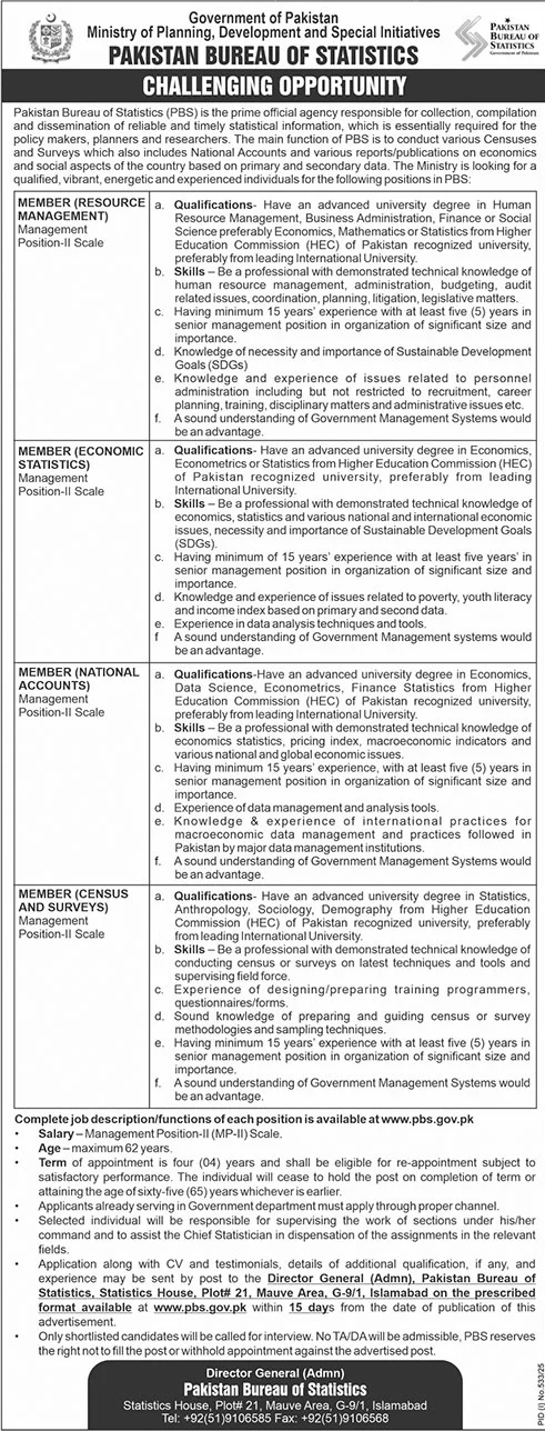 Pakistan Bureau of Statistics (PBS) is the prime official agency responsible for collection, compilation and dissemination of reliable and timely statistical information. The Ministry is looking for a dynamic team of Members to lead the core functions of the PBS. Applications are invited from vibrant, energetic and experienced individuals.