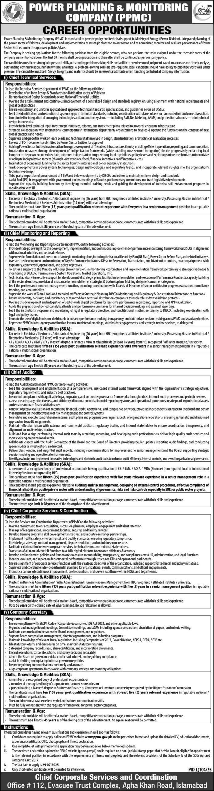 | Company Secretary | – Act as the primary custodian of the company’s legal documents, corporate records, and company seal. – Ensure strict compliance with the Public Sector Companies (Corporate Governance) Rules, the SOE Act 2023, and directives from PPRA, NEPRA, and SECP. – Facilitate all Board of Directors communication, prepare meeting agendas, and ensure accurate minute-writing. | – Must be a member of a recognized body of corporate or chartered secretaries, OR hold a Master’s degree in Business Administration, OR be a Law graduate from an HEC recognized university. | – At least 05 years of relevant experience in a reputable national or multi-national organization. – Must possess excellent verbal, written communication, and legal drafting skills. – Maximum Age: 55 years. |