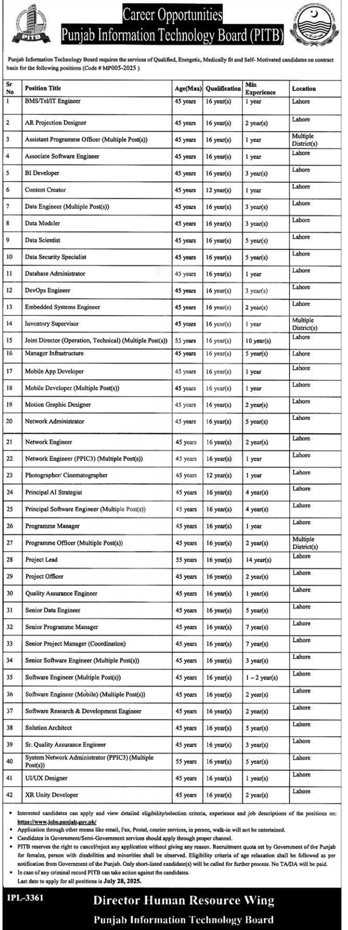 The Punjab Information Technology Board (PITB) invites applications from qualified and experienced professionals for a wide range of contract-based positions. These exciting opportunities are available in Lahore and other districts for various technology-focused projects.