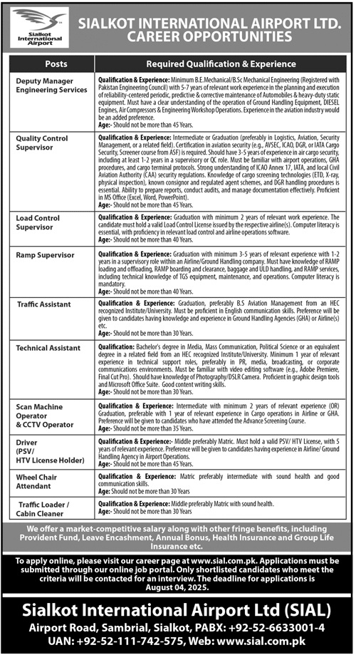 Sialkot International Airport Ltd. (SIAL) is looking for qualified and experienced individuals for various positions. We offer a market-competitive salary along with other fringe benefits including Provident Fund, Leave Encashment, Annual Bonus, Health Insurance and Group Life Insurance.