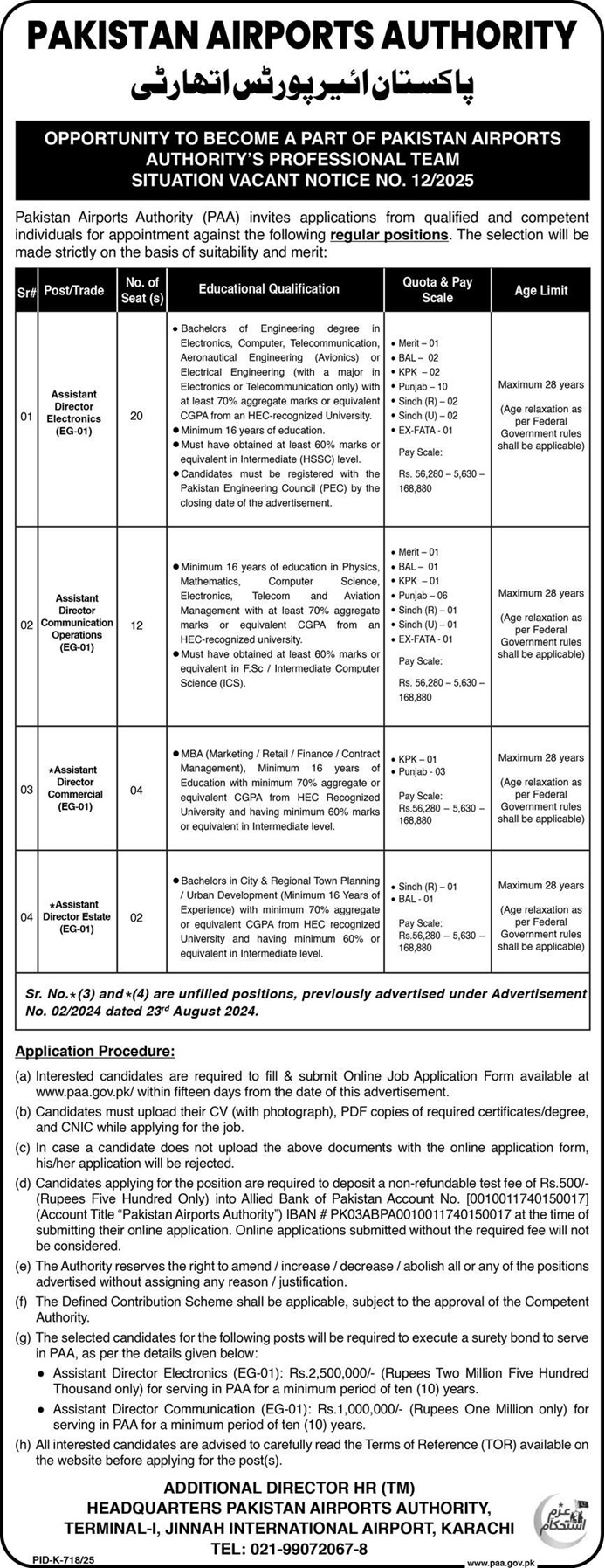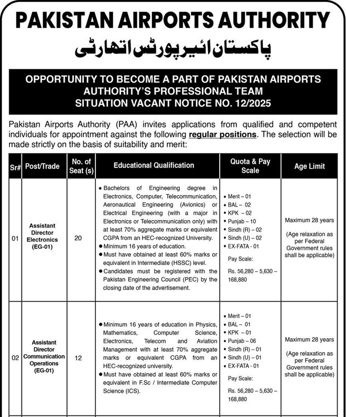 Pakistan Airports Authority (PAA) invites applications from qualified and competent individuals for appointment against the following regular positions. The selection will be made strictly on the basis of suitability and merit.