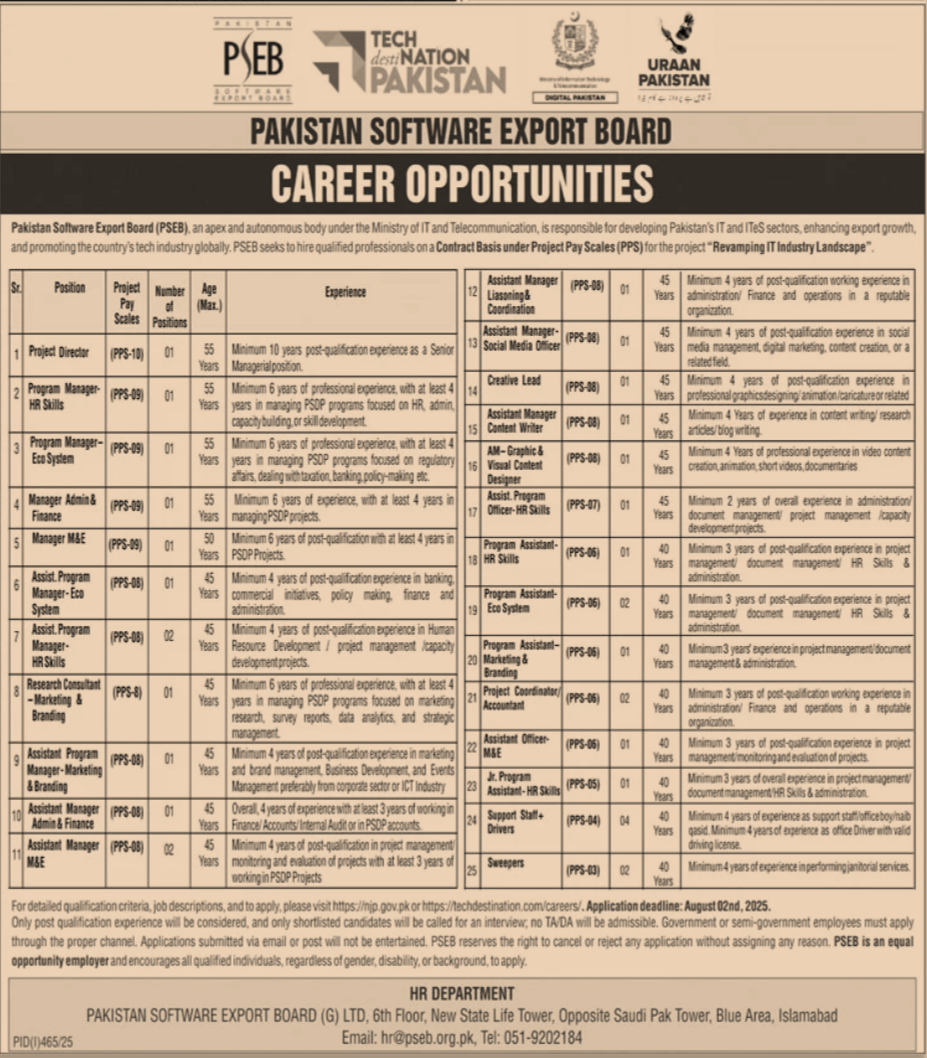 Pakistan Software Export Board (PSEB), an apex and autonomous body under the Ministry of IT and Telecommunication, is responsible for developing Pakistan’s IT and ITeS sectors. PSEB seeks to hire qualified professionals on a Contract Basis under Project Pay Scales (PPS) for the project “Revamping IT Industry Landscape”.