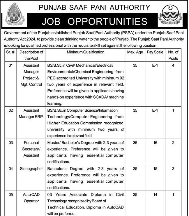 Government of the Punjab established Punjab Saaf Pani Authority (PSPA) under the Punjab Saaf Pani Authority Act 2024, to provide clean drinking water to the people of Punjab. The Punjab Saaf Pani Authority is looking for qualified professionals with the requisite skill set against the following positions.