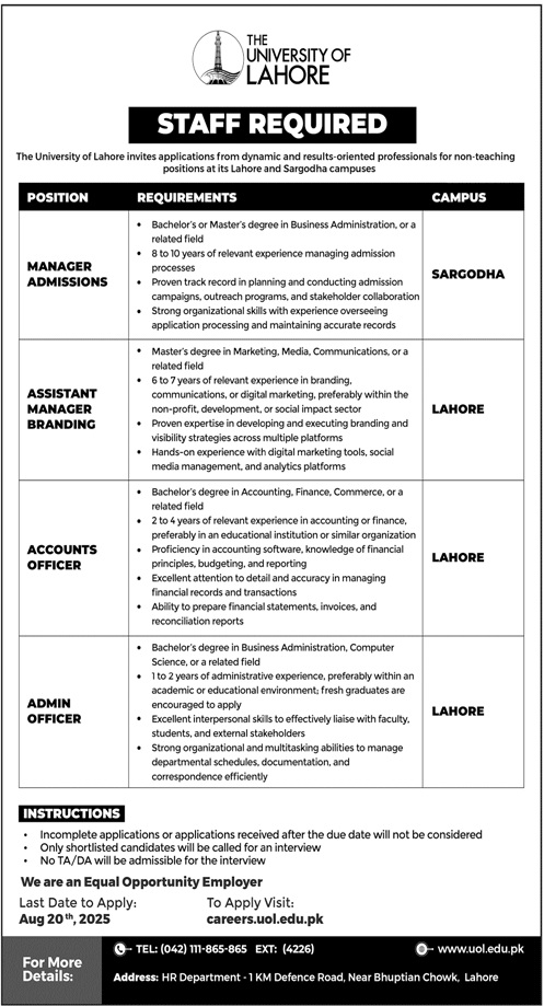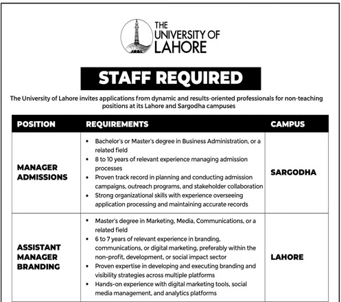 The University of Lahore invites applications from dynamic and results-oriented professionals for non-teaching positions at its Lahore and Sargodha campuses.