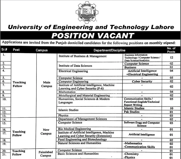 The University of Engineering and Technology Lahore is more than an institution—it’s an incubator for the dreams and aspirations of Pakistan’s youth. This recruitment drive for Teaching Fellows and Teaching Assistants is not just about filling positions.