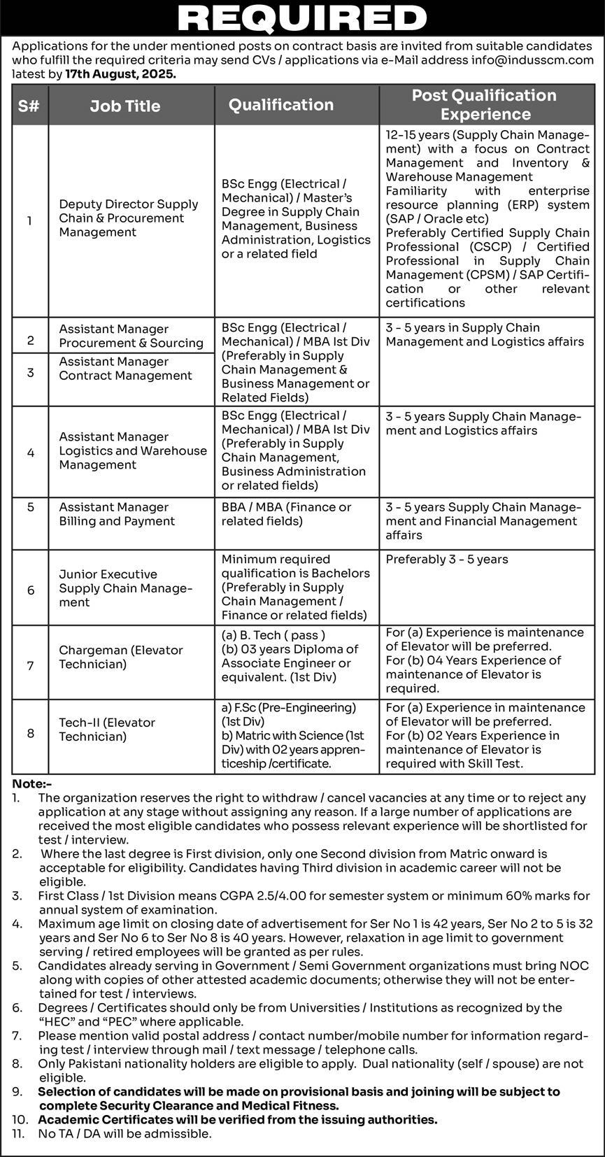 Assistant Manager Contract ManagementBSc Engg (Electrical/Mechanical) or MBA (1st Div). Preferably in Supply Chain Management.3-5 years in Supply Chain Management and Logistics.32 Years