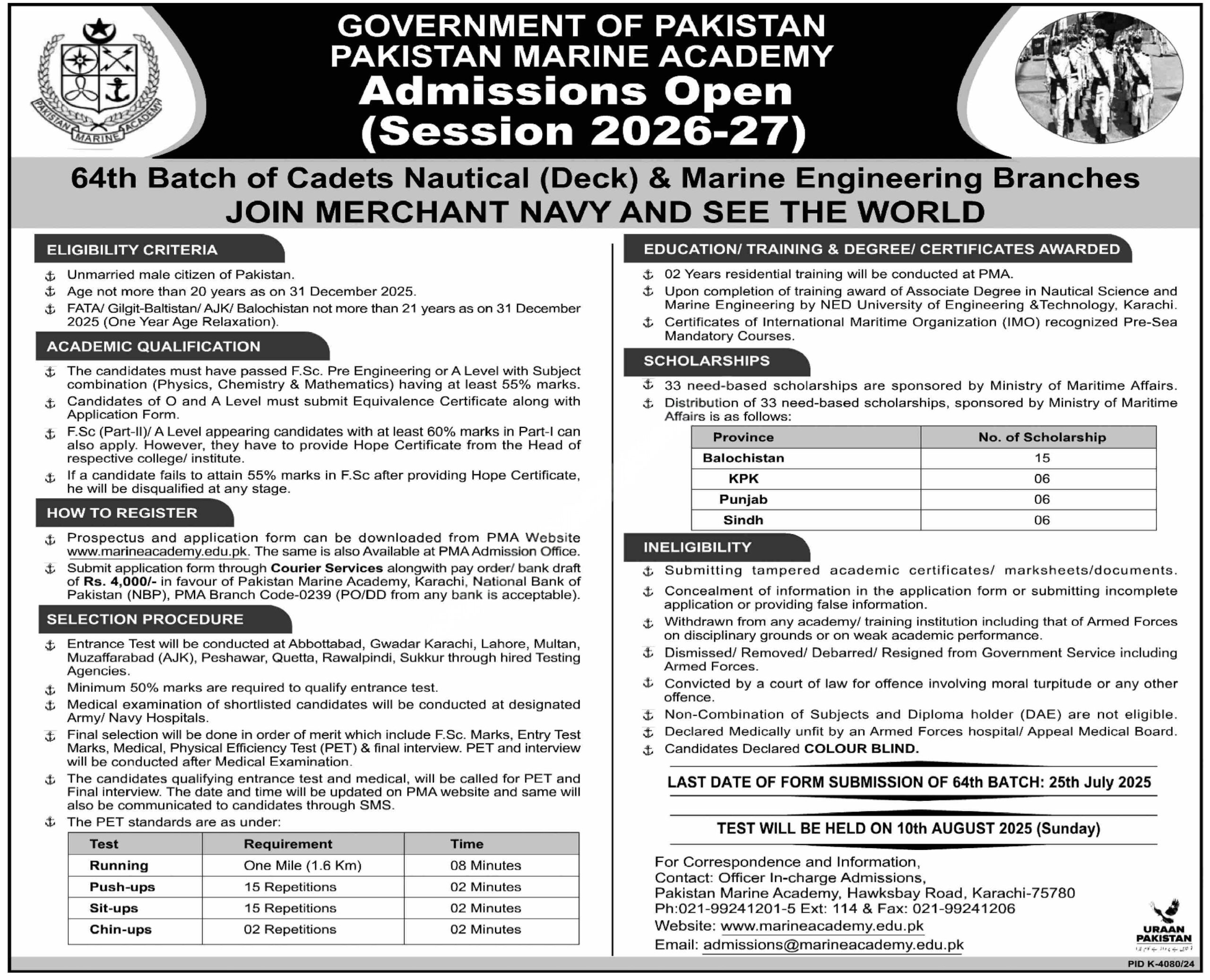 | Eligibility Criteria | Nationality: Unmarried male citizen of Pakistan. Age (Nautical): Not more than 20 years as on 31st December 2025. Age (Engineering/Special Regions): Not more than 21 years as on 31st December 2025 (This one-year age relaxation applies to Marine Engineering candidates and all candidates from FATA/Gilgit-Baltistan/AJK/Balochistan). |