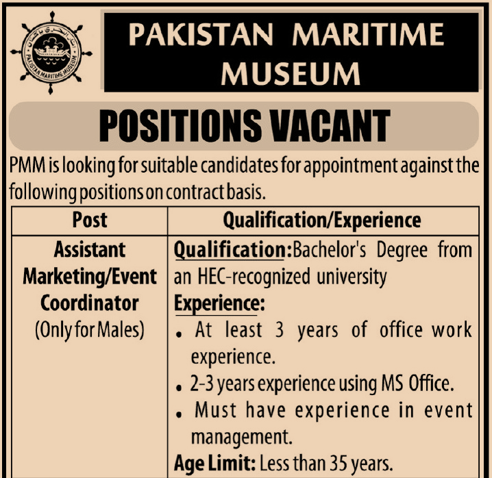 Skills: Museum event management, cultural event coordination Karachi, public relations for museums, venue marketing, visitor engagement strategies, strong proficiency in MS Office, excellent organizational and communication skills.